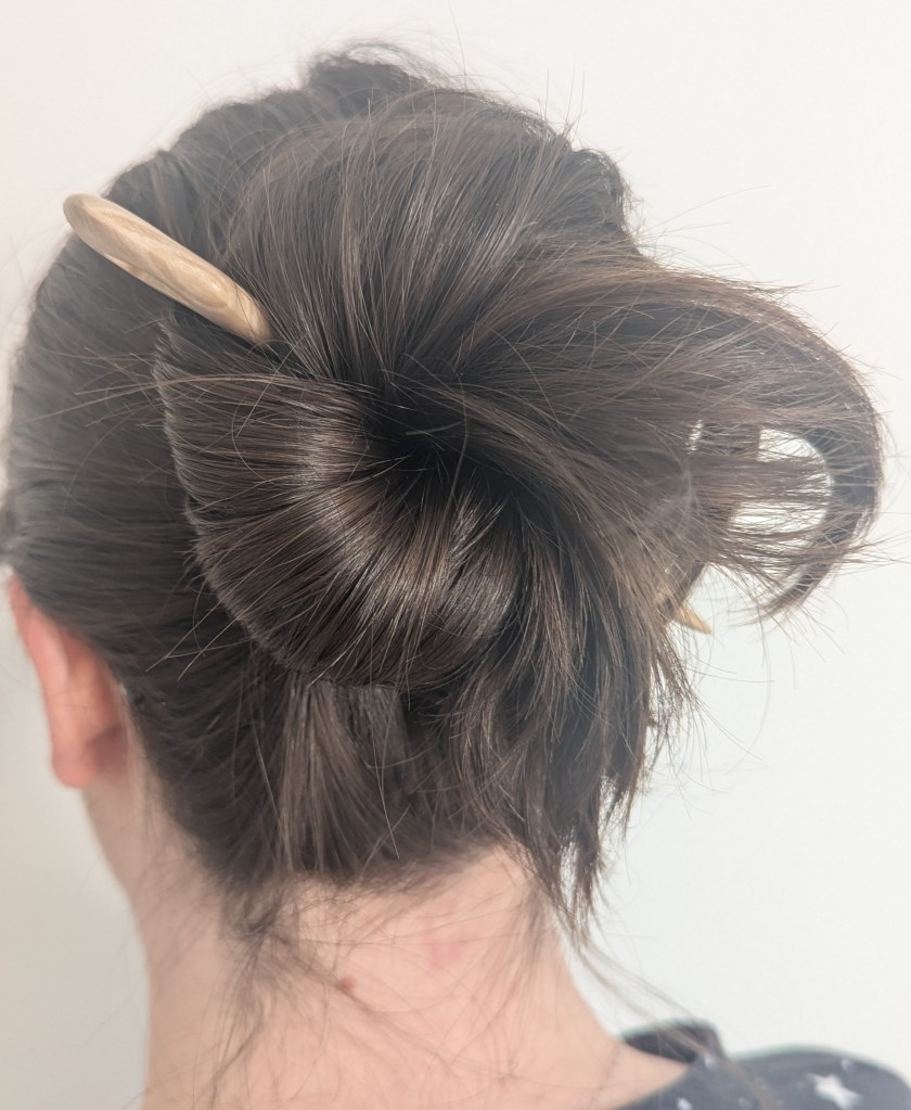 However, I have come across some pitfalls. I have really thick hair and I don’t think I understood that there were different types of hair forks for different hair types. The one I’ve purchased does a good job at holding up a half-up-half-down style, but it can’t keep a whole bun of for long, especially if I’m getting on with chores and moving around a lot.
